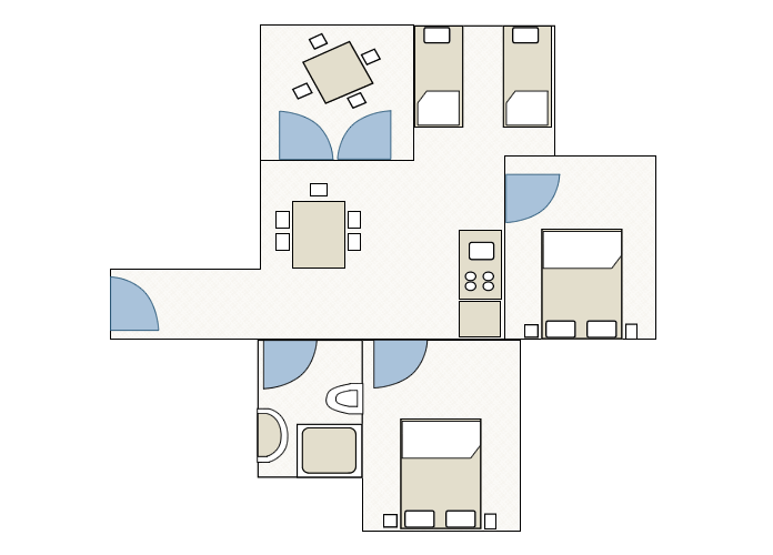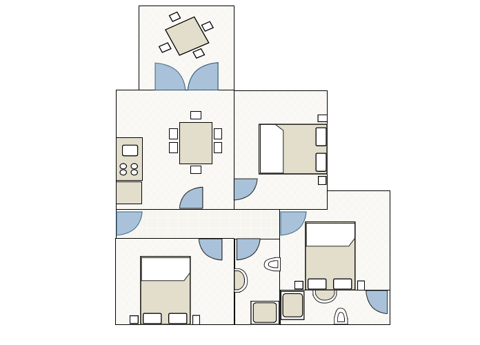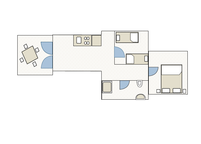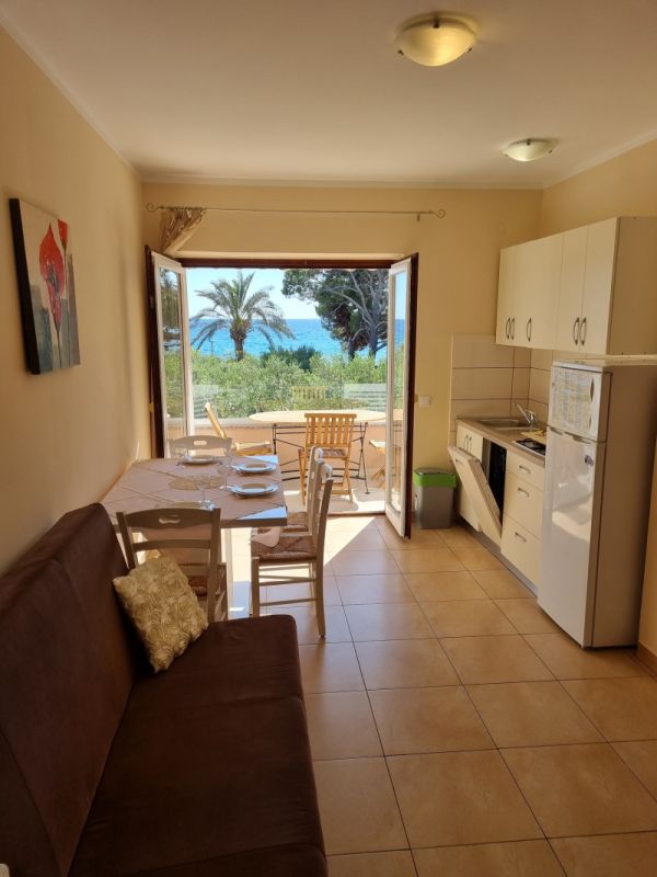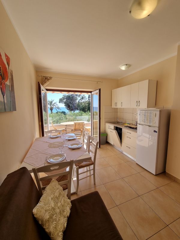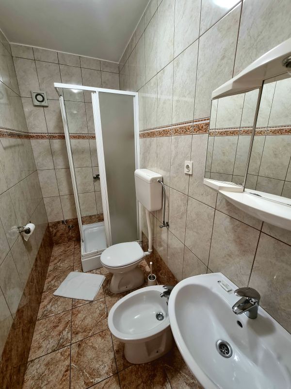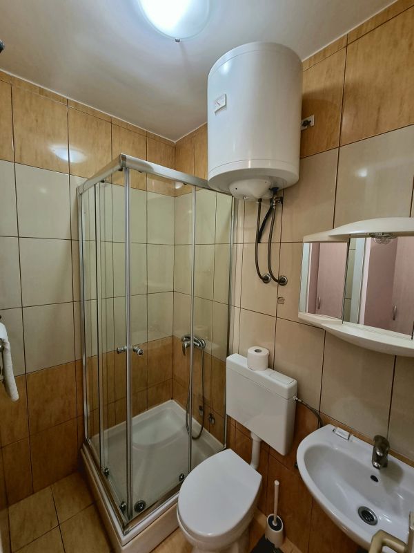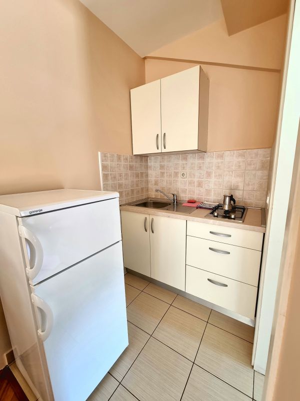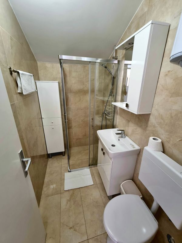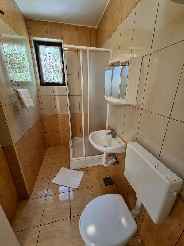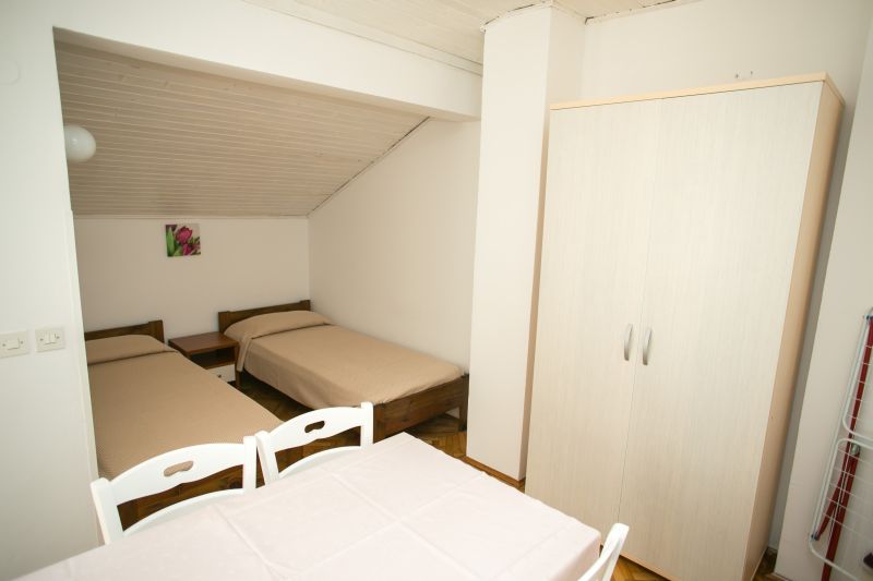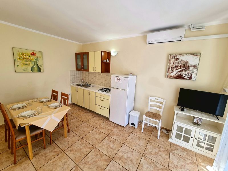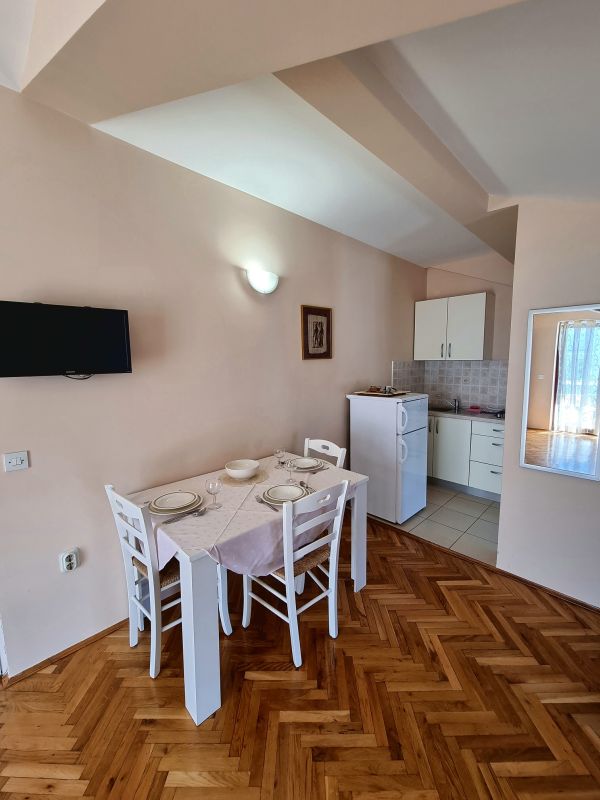 - jedna trokrevetna soba sa bračnim krevetom i pomoćnim ležajem, kuhinja sa blagovaonicom u istom prostoru